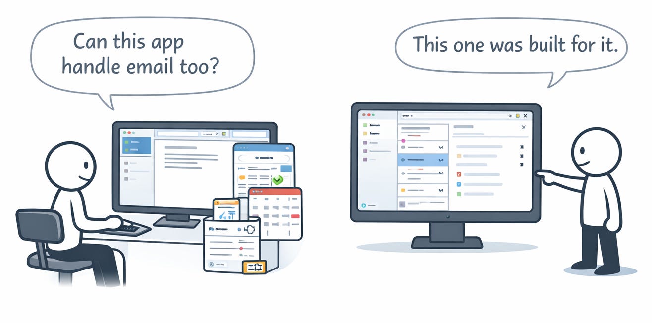 Google Wave went the other way. It launched with chat, email, a forum, and a document editor, all at once. Nobody could tell you what it was for, and it was dead in 15 months.