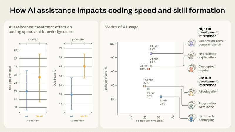 Anthropic just ran a randomized controlled trial that challenges this. 52 developers learned a new Python library for async programming, half with AI assistance, half without. The AI group scored 17% lower on comprehension tests. That's nearly two letter grades (50% vs 67%, p=0.01).