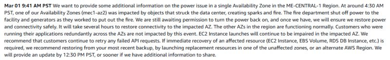 The UAE region has three availability zones, and the strikes took out two. AWS's redundancy model can survive the loss of a single zone, but not an attack on multiple zones.