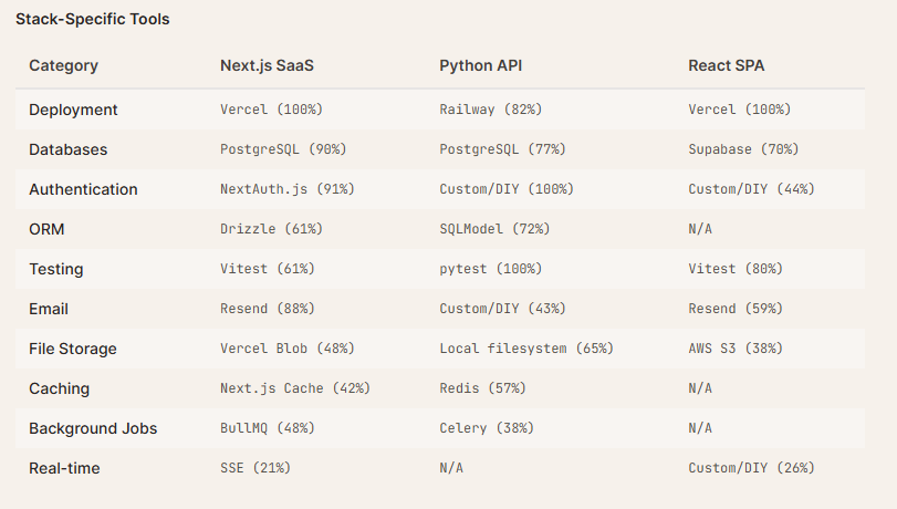 The same model picks Vercel for JavaScript and Railway for Python. Drizzle for Next.js, SQLModel for FastAPI. This is not a fixed list; the agent reads the stack and adapts, which is more useful than a blanket recommendation.