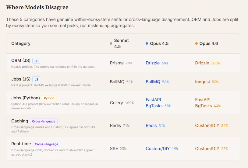 This is the clearest signal from this dataset. Prisma goes from 79% in Sonnet 4.5 to 0% in Opus 4.6. Drizzle takes over completely. In Python projects, Celery usage collapses from 100% to 0% as newer models prefer FastAPI's built-in background tasks. It tracks with what appeared in more recent training data.
