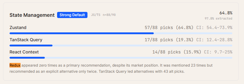 Redux didn't get any primary picks in these 2,430 prompts. The model knows it exists, with 23 mentions and 2 alternative recommendations, but never actually chooses it.