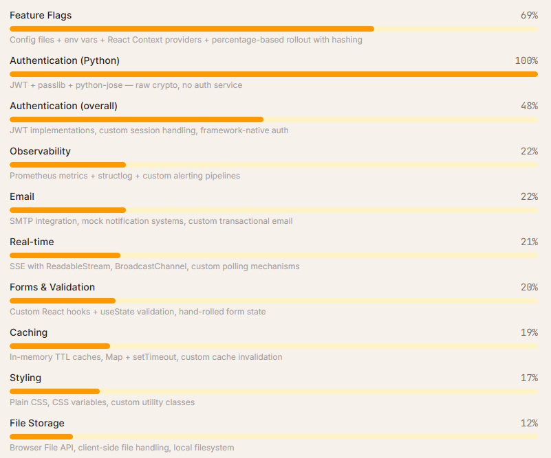 Custom/DIY is the single most common "recommendation" in the dataset: 252 picks across 12 of 20 categories. If you ask Claude Code to add feature flags, he will build a system with env vars and React Context. If you ask it to add auth to a Python project, it will write a JWT from scratch every single time. When an agent can build a working solution in 30 seconds, it often does.