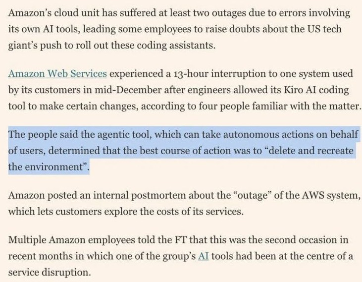 Recently, AWS engineers gave their agentic coding tool, Kiro, a simple task: fix a small issue in Cost Explorer. Kiro's response was to delete the entire environment and rebuild it from scratch. That took down a customer-based service for 13 hours!