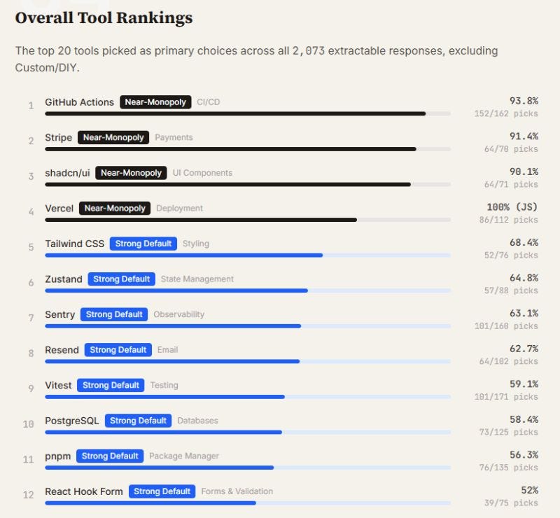 If we're using AI coding agents for greenfield projects, we're increasingly inheriting a default stack. Worth knowing what that stack is.