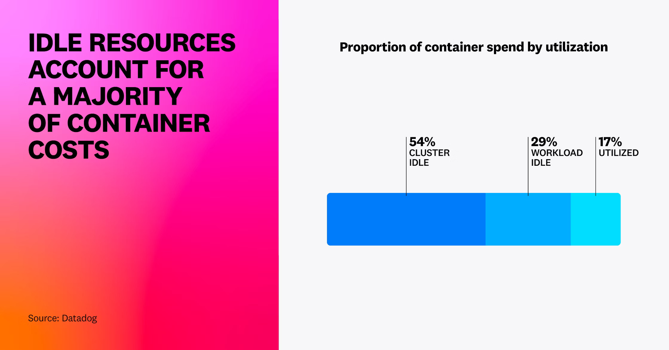 Over 80% of container spend is spent on idle resources. Another significant trend in the report is the increasing use of containers, which now account for up to 35% of EC2 compute spend, up from 30% a year ago. However, this growth comes with a caveat: 83% of container costs are associated with idle resources, with 54% of this spend being on cluster idle and 29% on workload idle. This highlights the need for organizations to optimize their container usage and avoid overprovisioning cluster infrastructure.