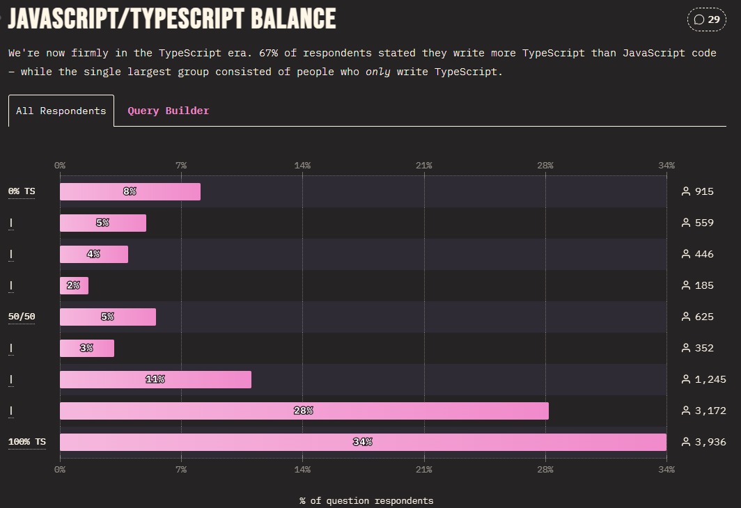 The largest segment of respondents now consists of developers who exclusively write TypeScript.
