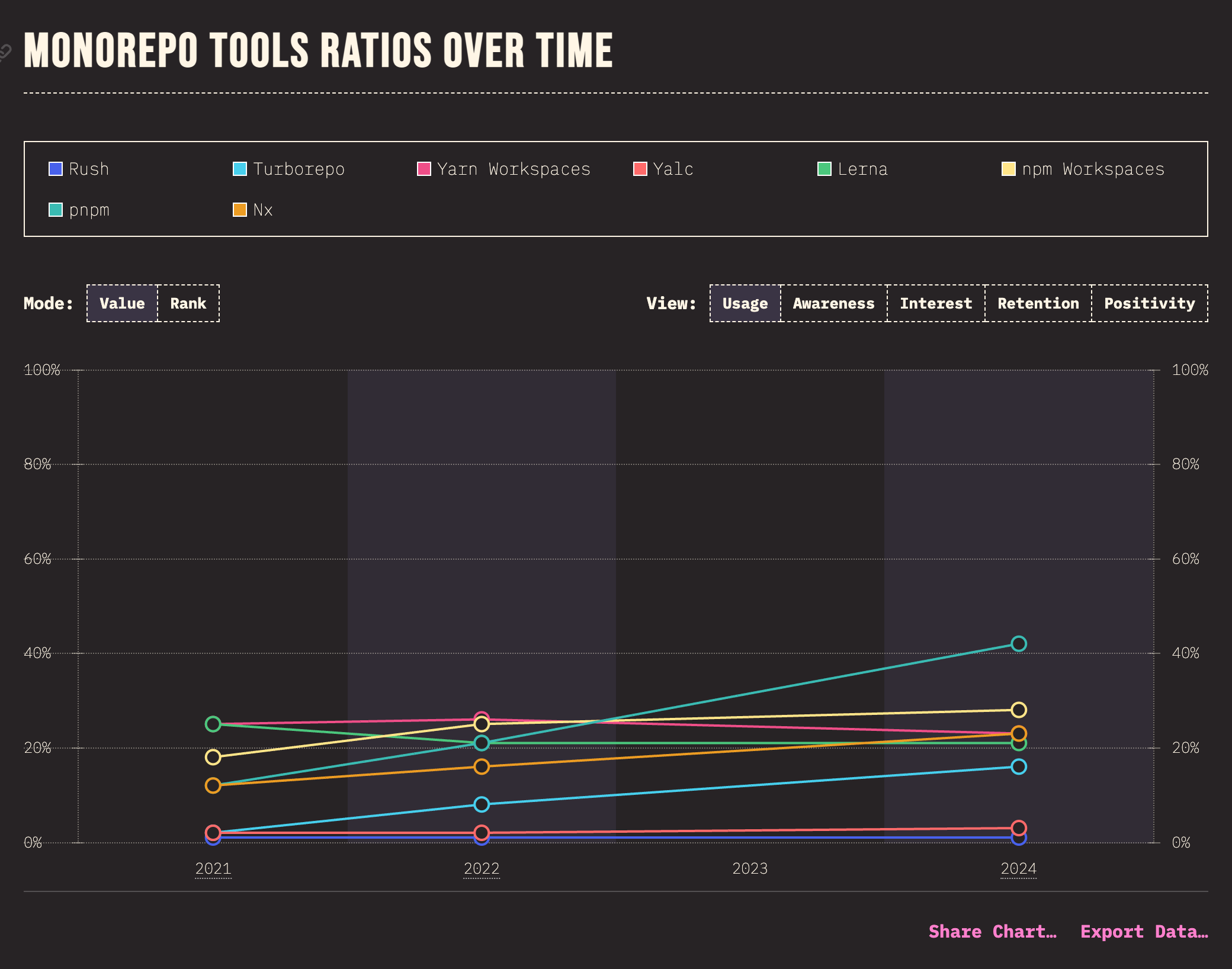 Mono repo tools remain fragmented, with multiple solutions evenly utilized. However, pnpm stands out for its steady retention rate, showing its staying power in the ecosystem.