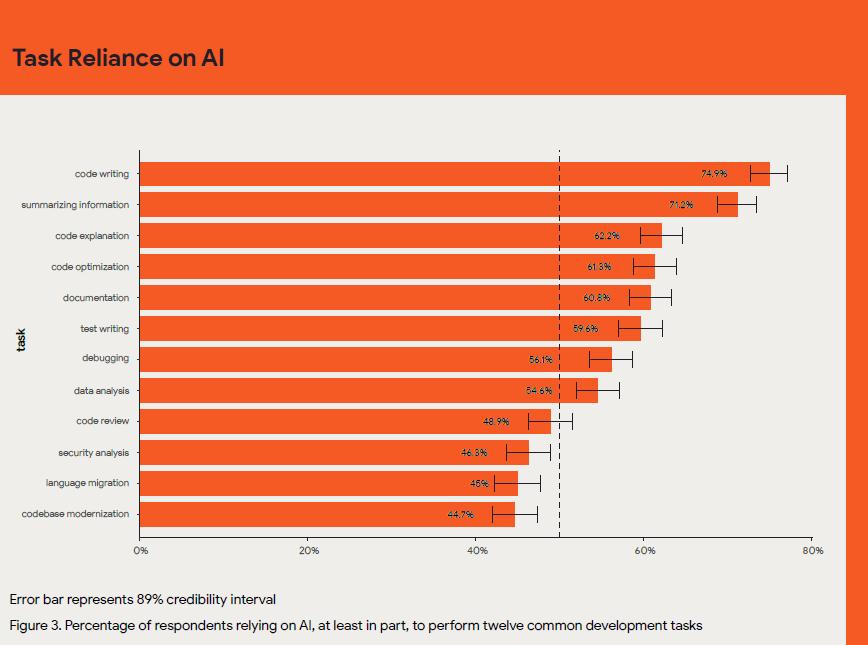 Regarding adoption, 75% of respondents said they use AI for at least one of their everyday tasks. AI was most commonly employed for code generation and information summarization here, which is consistent with feedback from across the Salesforce ecosystem.