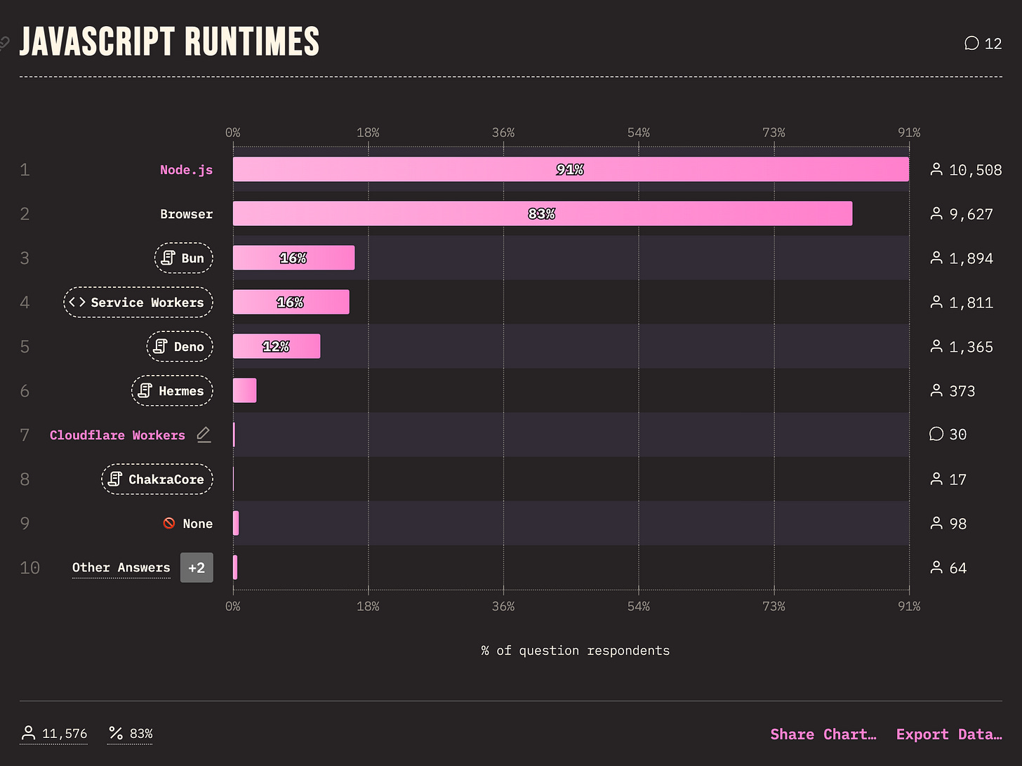 Node.js is the clear leader in runtimes, chosen by 91% of respondents. However, newer runtimes are starting to make waves, as Bun received 16% mentions, making it the most discussed write-in option.