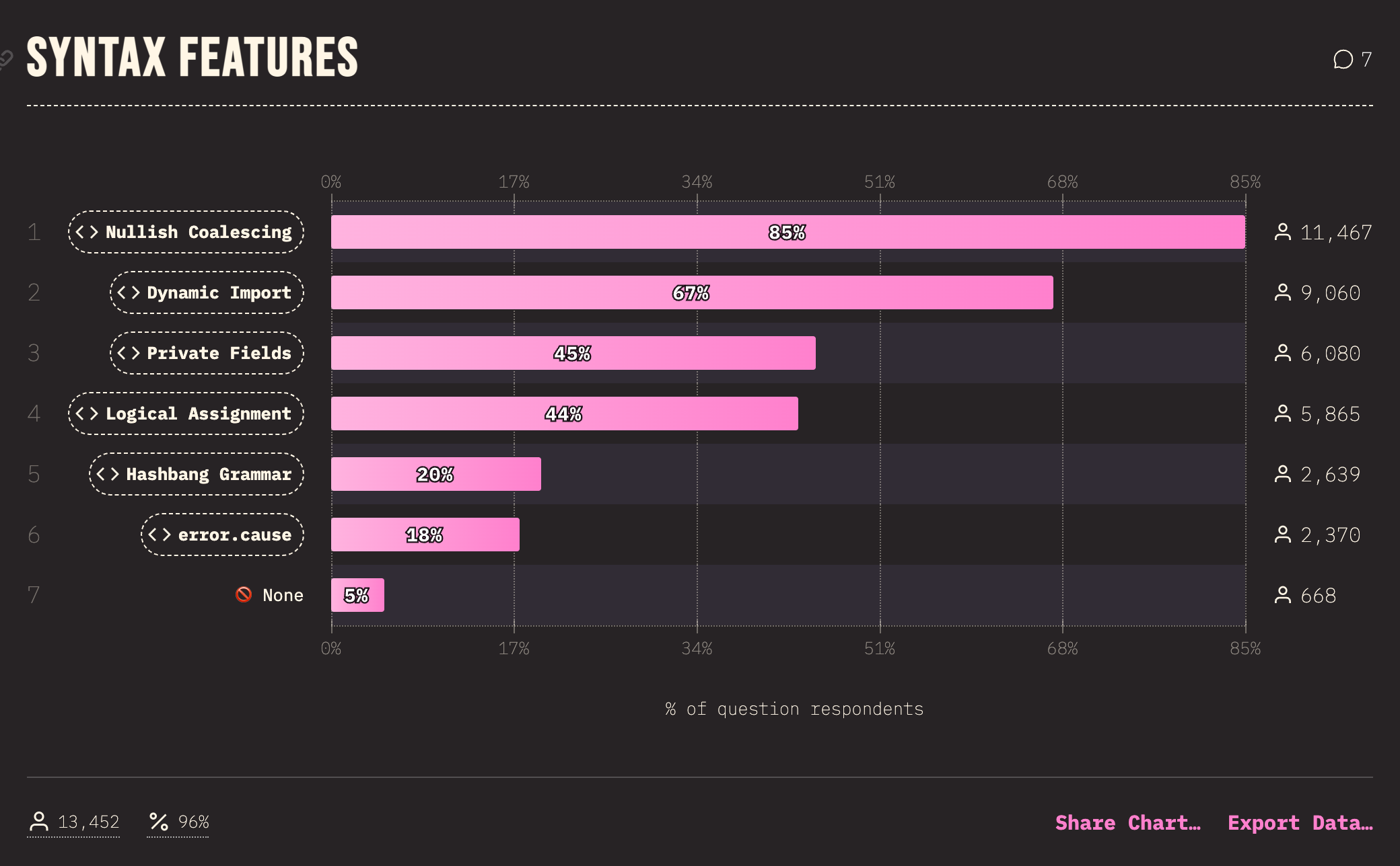 The nullish coalescing operator (??) took the top spot as the most widely adopted JavaScript syntax feature, reflecting its utility in handling null or undefined values efficiently.