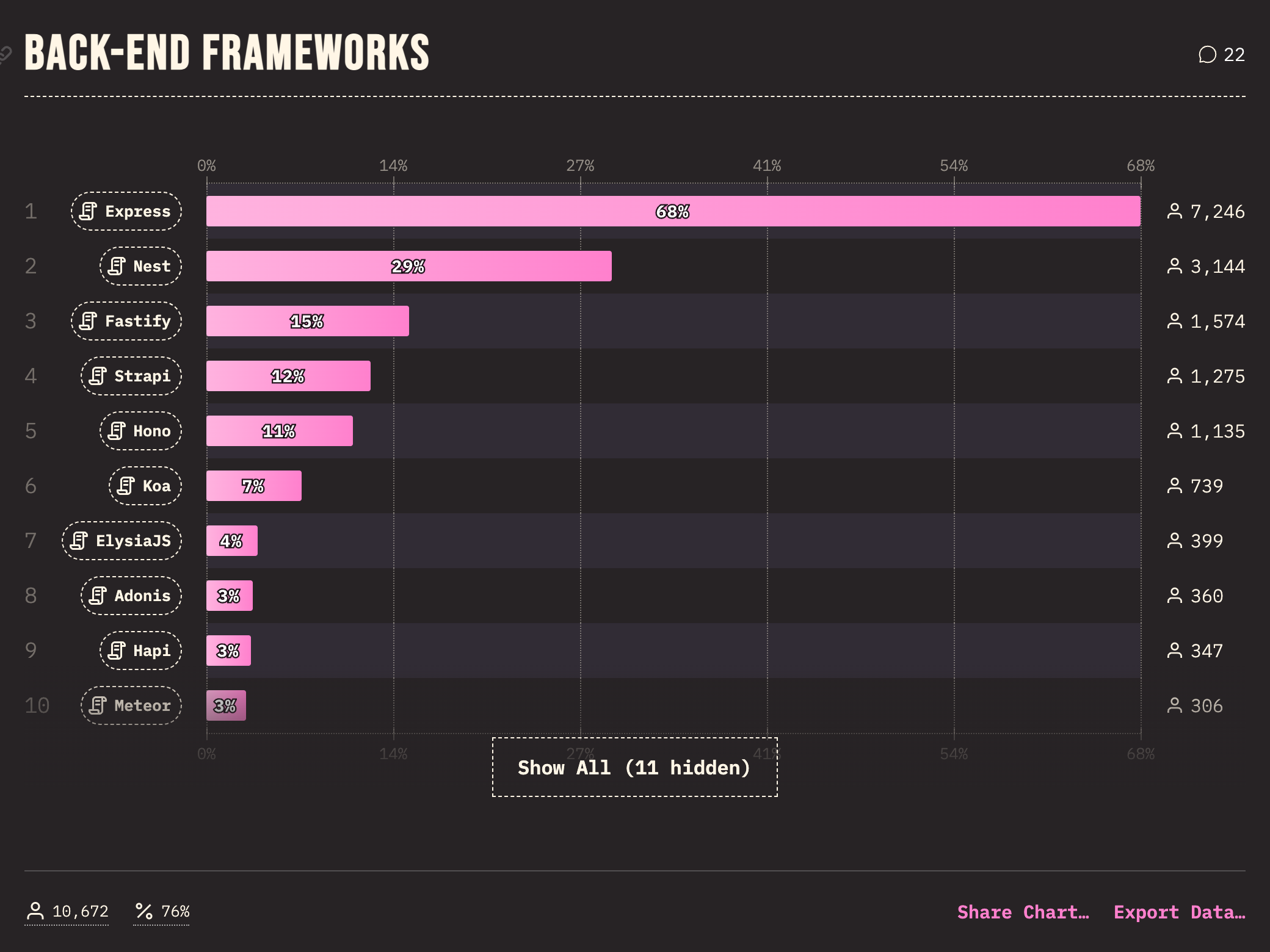 Express remains the most used back-end framework for JavaScript developers, with 68% adoption. Its reliability and extensive ecosystem continue to appeal to developers. Meanwhile, Nest.js has grown to 29% adoption, showing momentum as a modern back-end alternative.