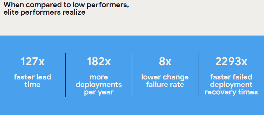 Elite performers can deploy multiple times daily, recover from failures in less than an hour, and have change failure rates as low as 5%.