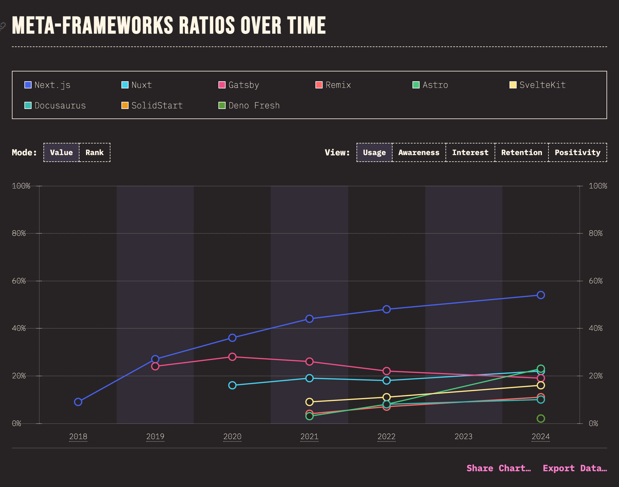 Next.js leads the meta-framework category, offering server-side rendering and static site generation for React-based web apps. Other frameworks, such as Remix, Astro, and SvelteKit, are gaining traction but remain below 20% adoption.