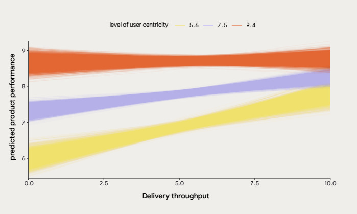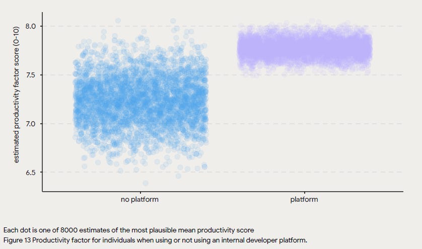 Implementing internal development platforms increased team and individual developer productivity by 10% and 8%, respectively. However, stability (14%) and change throughput (8%) were sacrificed.