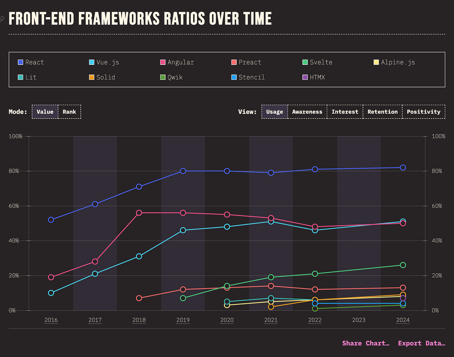 React continues to dominate the front-end framework space, with 82% adoption among respondents. It is followed by: