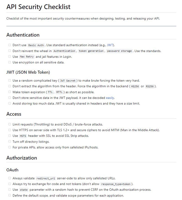 This checklist gives the most critical security countermeasures when designing, testing, and releasing your API in different categories, such as: