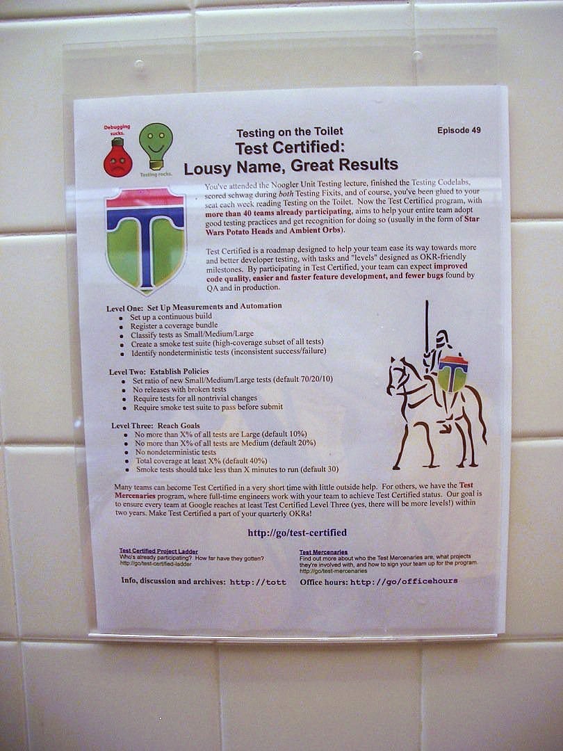 “Testing on the Toilet” is a one-page testing advice posted in stalls starting in April 2006. They evolved into what the authors describe as “the longest-running and most profound impact of any of the testing initiatives.”