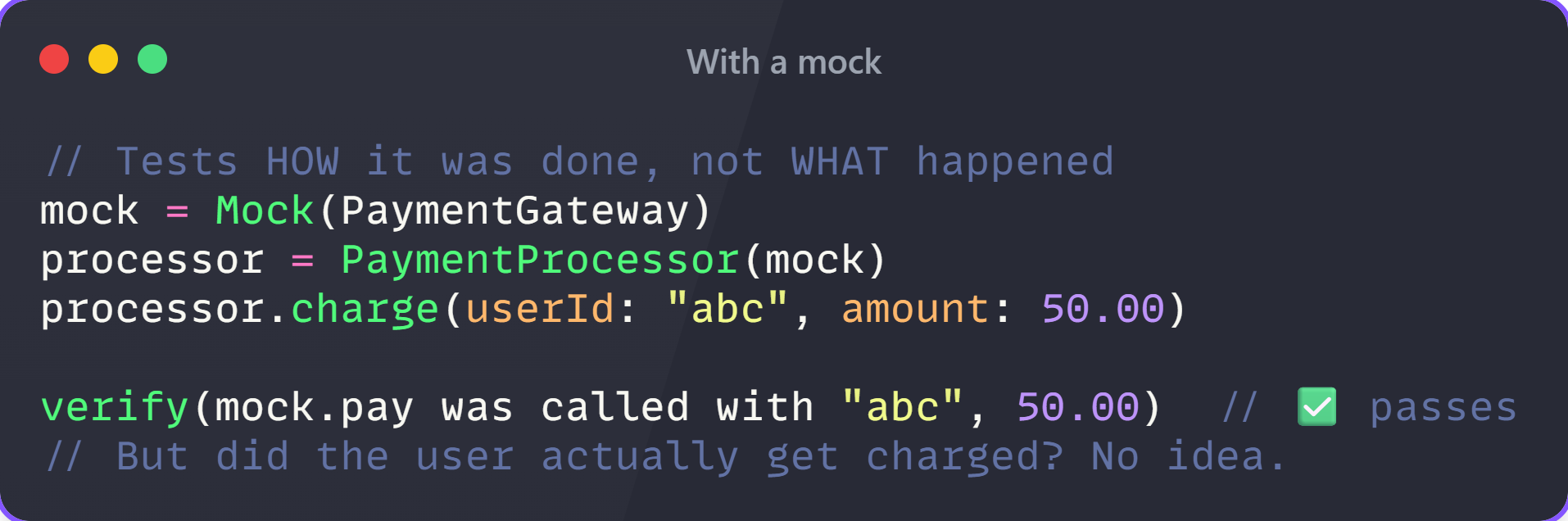 Now imagine this mock repeated 10,000 times across your codebase. Every refactor that changes how pay() it works breaks all of them, even if the payment still works perfectly.