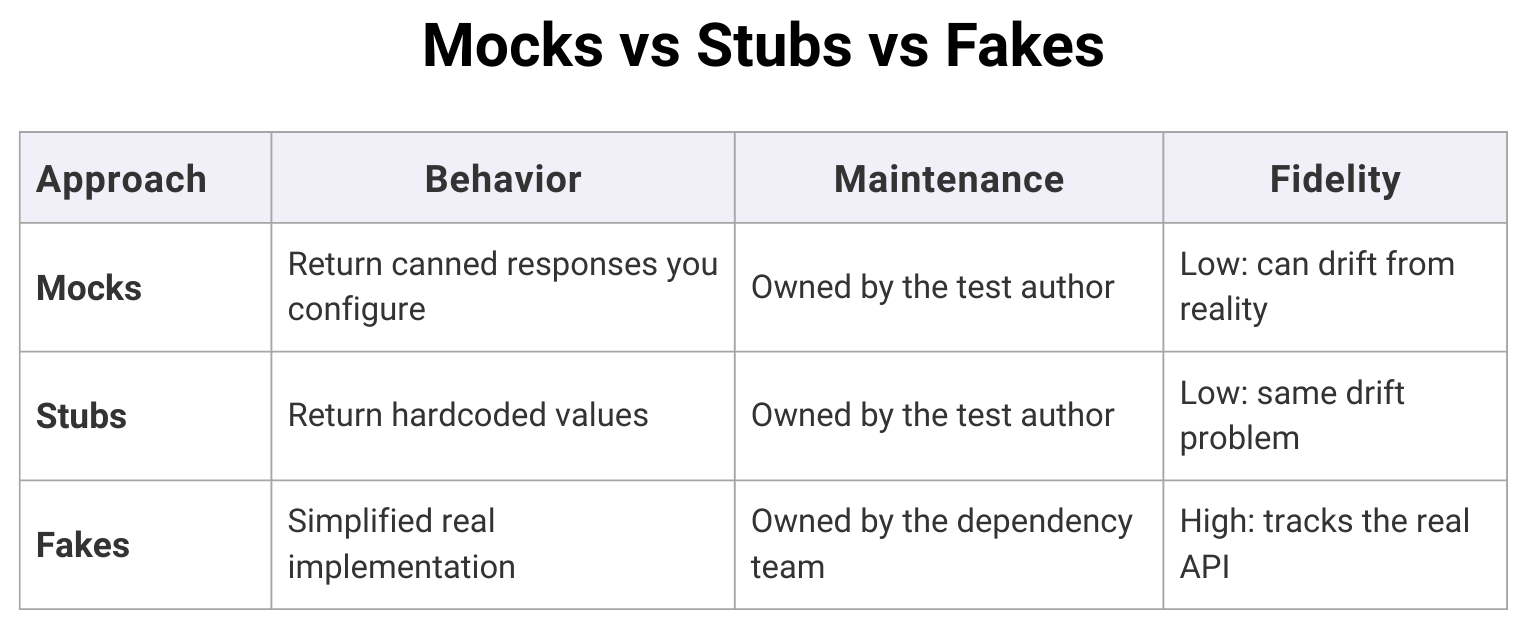 The trade-off is that fakes must be invested in. The team that owns the real implementation should maintain the fake, using contract tests that verify against both. If there are only a few consumers, it may not be worth writing a fake. But for popular APIs, the boost to productivity is huge.