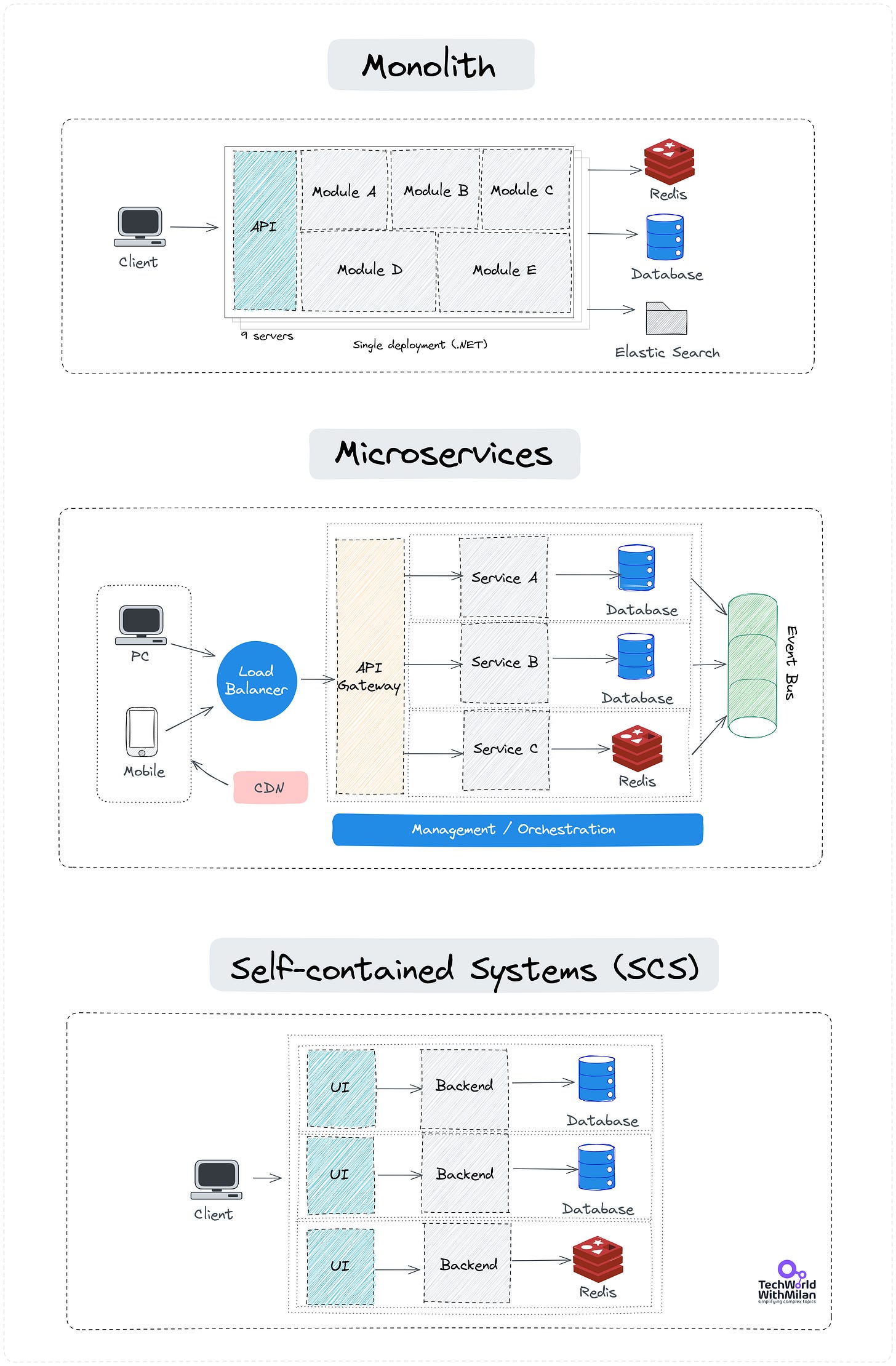 Self-contained Systems (SCS) are a software architecture approach that prioritizes the decentralization of applications into independent systems, each with its domain logic, UI, and data storage. Unlike Microservices, smaller services focused solely on business logic, SCS are larger and encompass a broader scope within a specific domain.