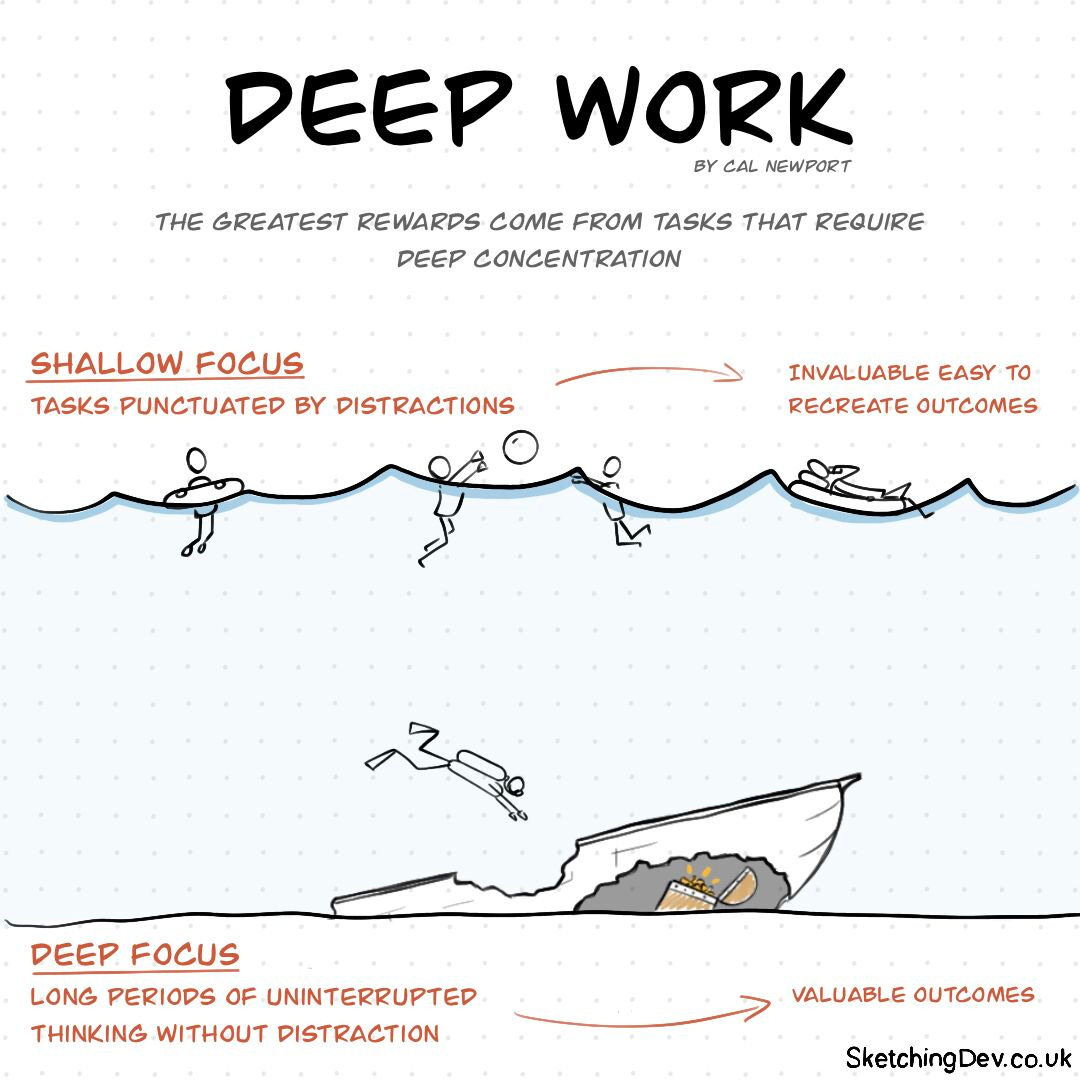 Cal Newport, a full-time professor of computer science at Georgetown University and author of the excellent “Deep Work” book [1], describes “deep work” as “professional activities performed in a state of distraction-free concentration that push your cognitive capabilities to their limit”. When you are in such an optimal state, you’re not only completing high-leverage work in an efficient way, but it’s also being done at an optimal quality. It’s a bit like being in “flow” or being “in the zone”, a state described in psychological terms as “Csíkszentmihályi” (full absorption and energized focus)!