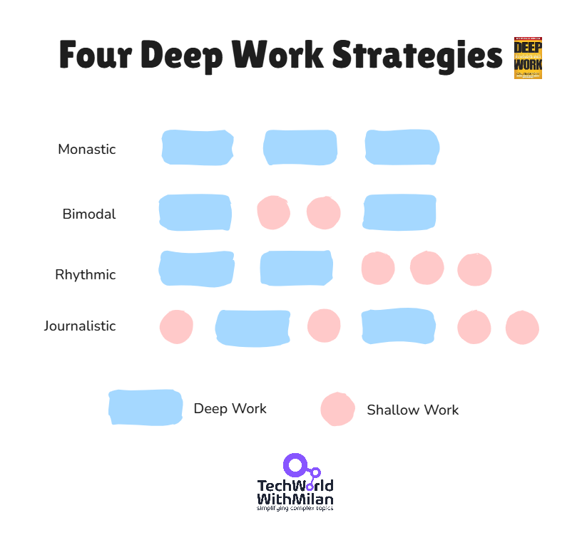 Strategies for deep work. There are four strategies of deep work listed by Newport: Monastic, Bimodal, Journalistic, and Rhythmic, and some practical techniques are time-blocking, batch communication, and focusing on